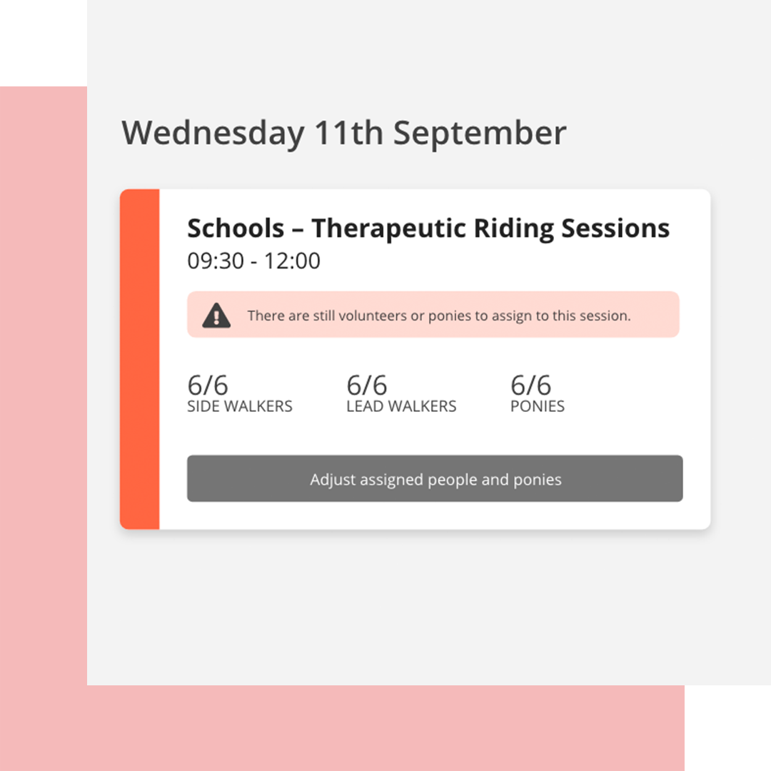 Volunteers on the system three main roles - organising a session with riders, side walkers and lead walkers, matching riders to horses and updating past session notes.
